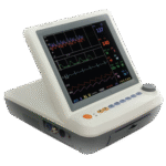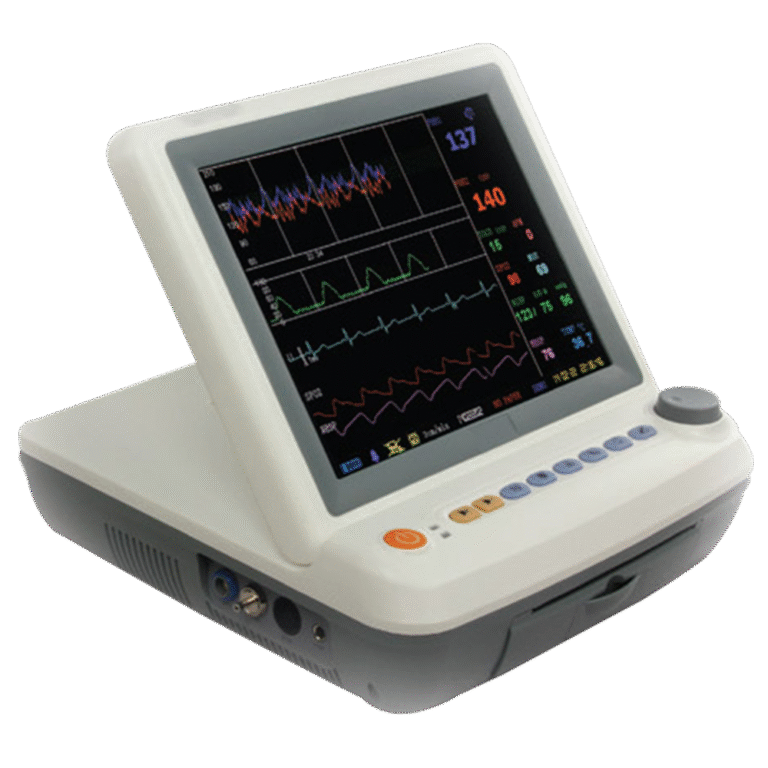 - Standard configuration includes FHR monitoring, TOCO, fetal movement, ECG, SpO₂, NiBP, respiration, and temperature.